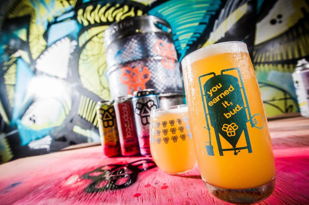 Bissell encourages patrons to come to the brewery to purchase the beer, so they can see all of this in action — the art, the mess, the Liquid Swords playing over the speakers, the broken pinball machine. Vendors that set up in the their parking lot, like the High Roller Lobster Company or the Mami Food Truck, are provided with table tents and laminated menus to incorporate them into the Bissell lifestyle as well.